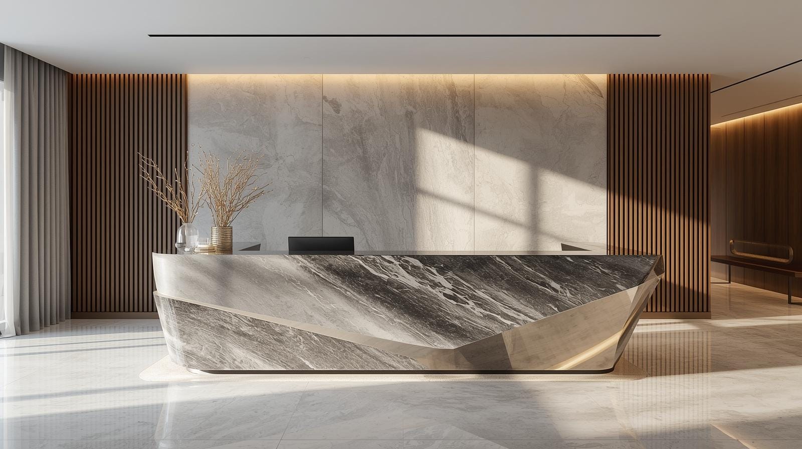 Acrylic có độ bóng cao, phản chiếu ánh sáng, giúp không gian rộng rãi và hiện đại hơn. Đây là yếu tố quan trọng trong những khu vực lễ tân cần tạo ấn tượng mạnh với khách hàng.