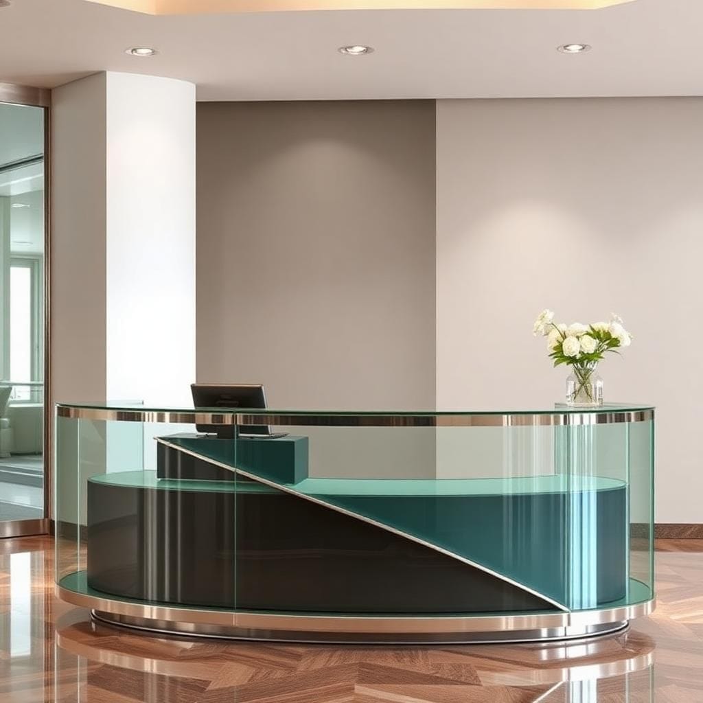 Quầy lễ tân kính trong hoặc kính màu, khung kim loại trẻ trung.