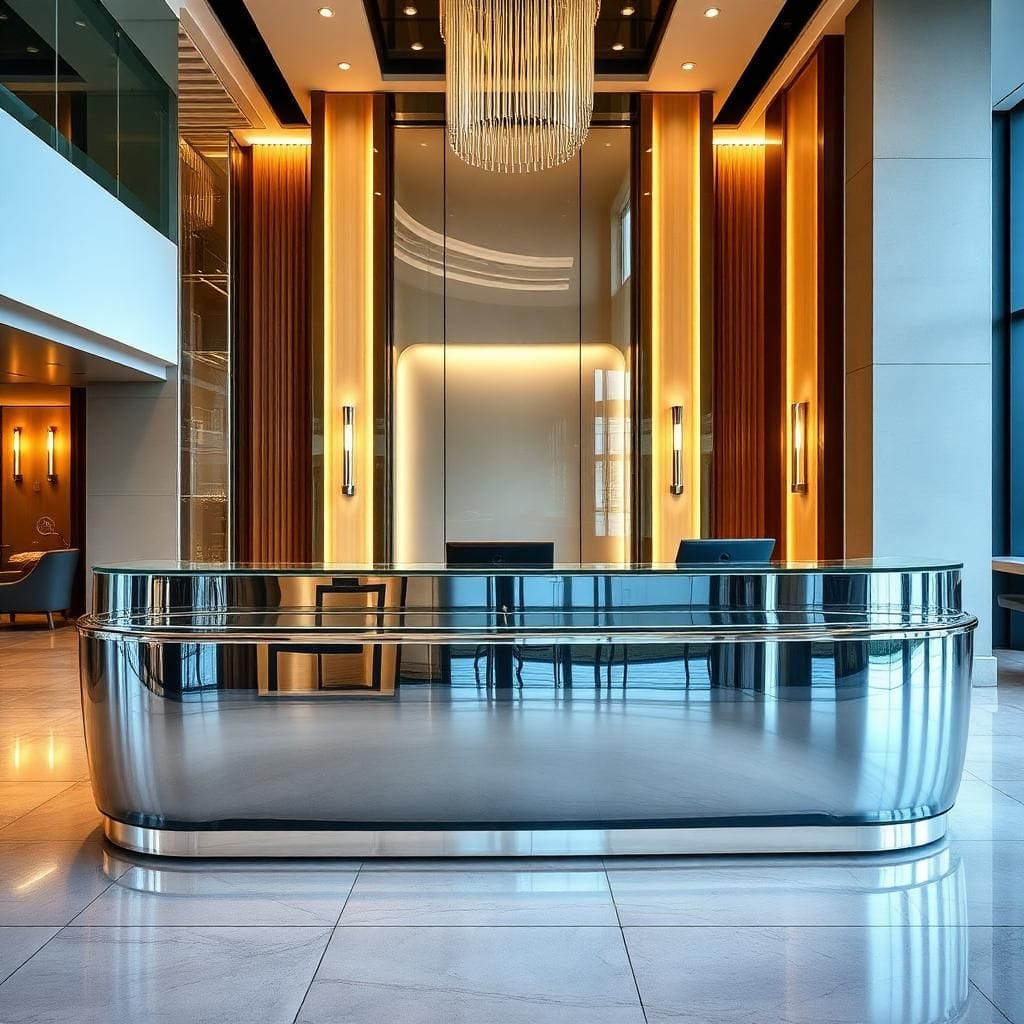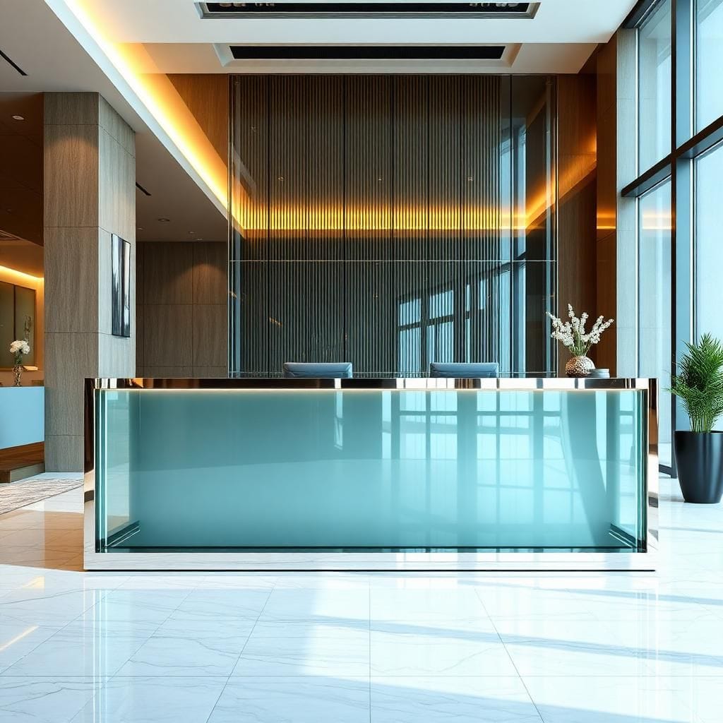 Kết hợp kính mờ, kính phản quang hoặc kính dán màu cao cấp với inox mạ vàng hoặc thép mạ PVD. Logo phát sáng hoặc đèn LED hắt sáng càng làm quầy lễ tân thêm phần sang trọng, phù hợp với khách sạn 4-5 sao, resort, trung tâm thương mại cao cấp.
