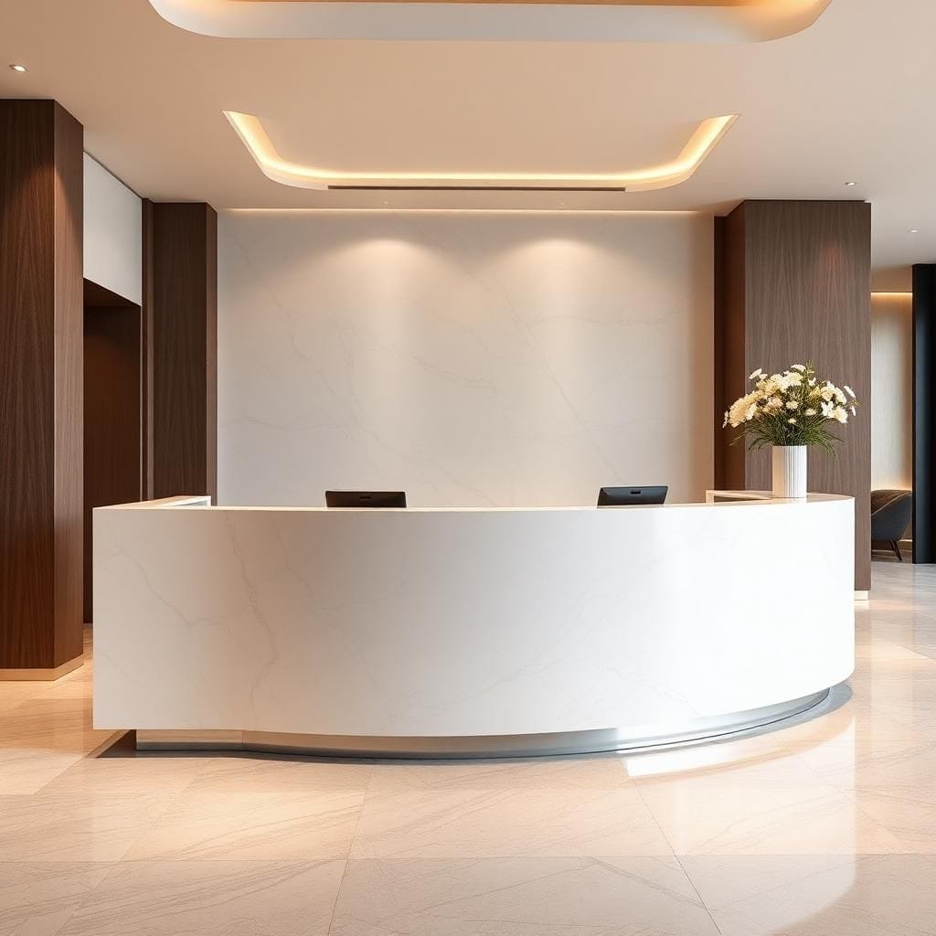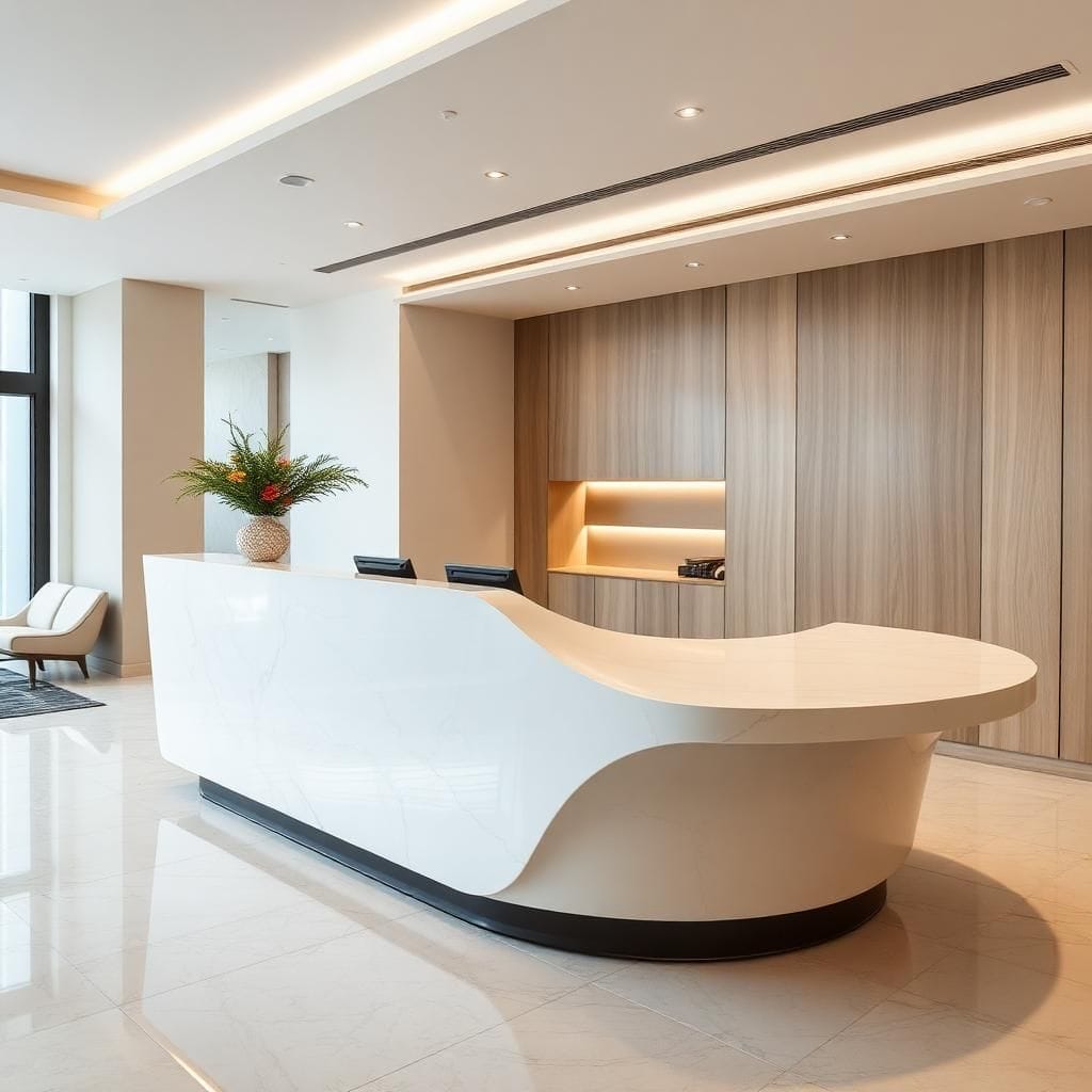 Solid Surface dễ uốn cong và cắt ghép, cho phép thiết kế quầy lễ tân thẳng, chữ L, chữ U hoặc bo cong mà vẫn đảm bảo tính thẩm mỹ.