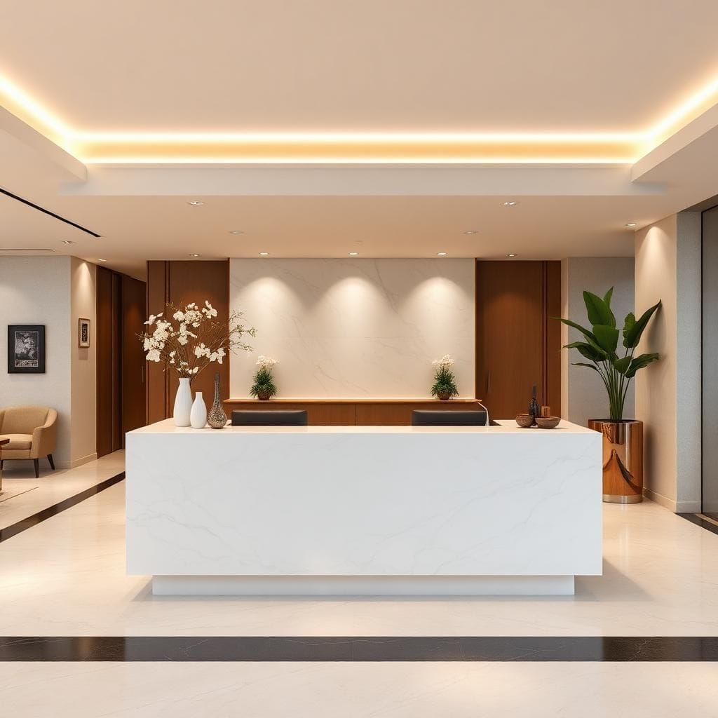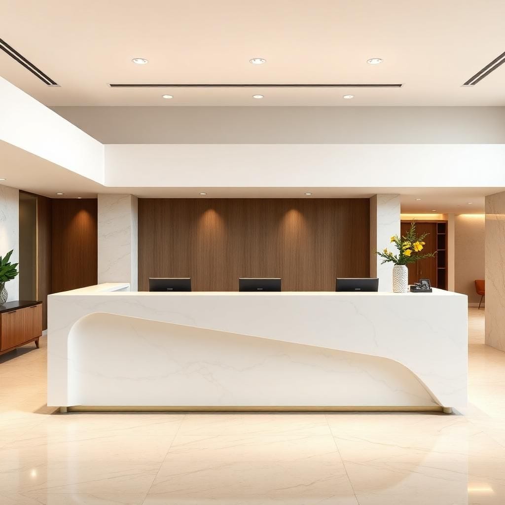 Trong spa, thẩm mỹ viện, quầy lễ tân Solid Surface bo cong mềm mại, sử dụng màu sáng (trắng, kem, be) hoặc vân mây nhẹ kết hợp ánh sáng vàng dịu, mang lại cảm giác thư giãn và tin cậy cho khách hàng.