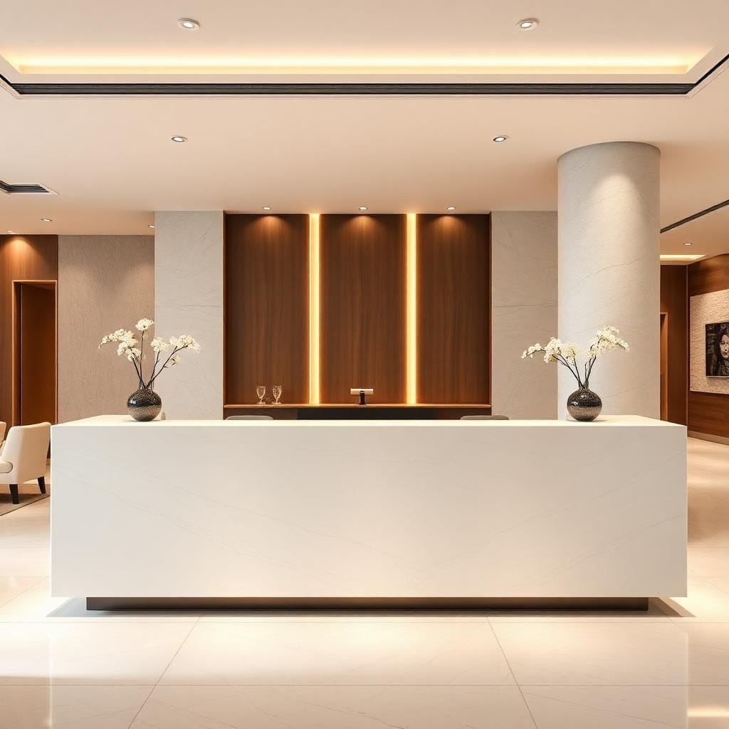 Các khách sạn, resort 4 – 5 sao thường ưu tiên quầy lễ tân Solid Surface vân đá tự nhiên, kết hợp ánh sáng LED và chi tiết inox mạ vàng. Thiết kế chữ U hoặc bo cong quy mô lớn giúp không gian thêm uy nghi, khẳng định đẳng cấp thương hiệu.