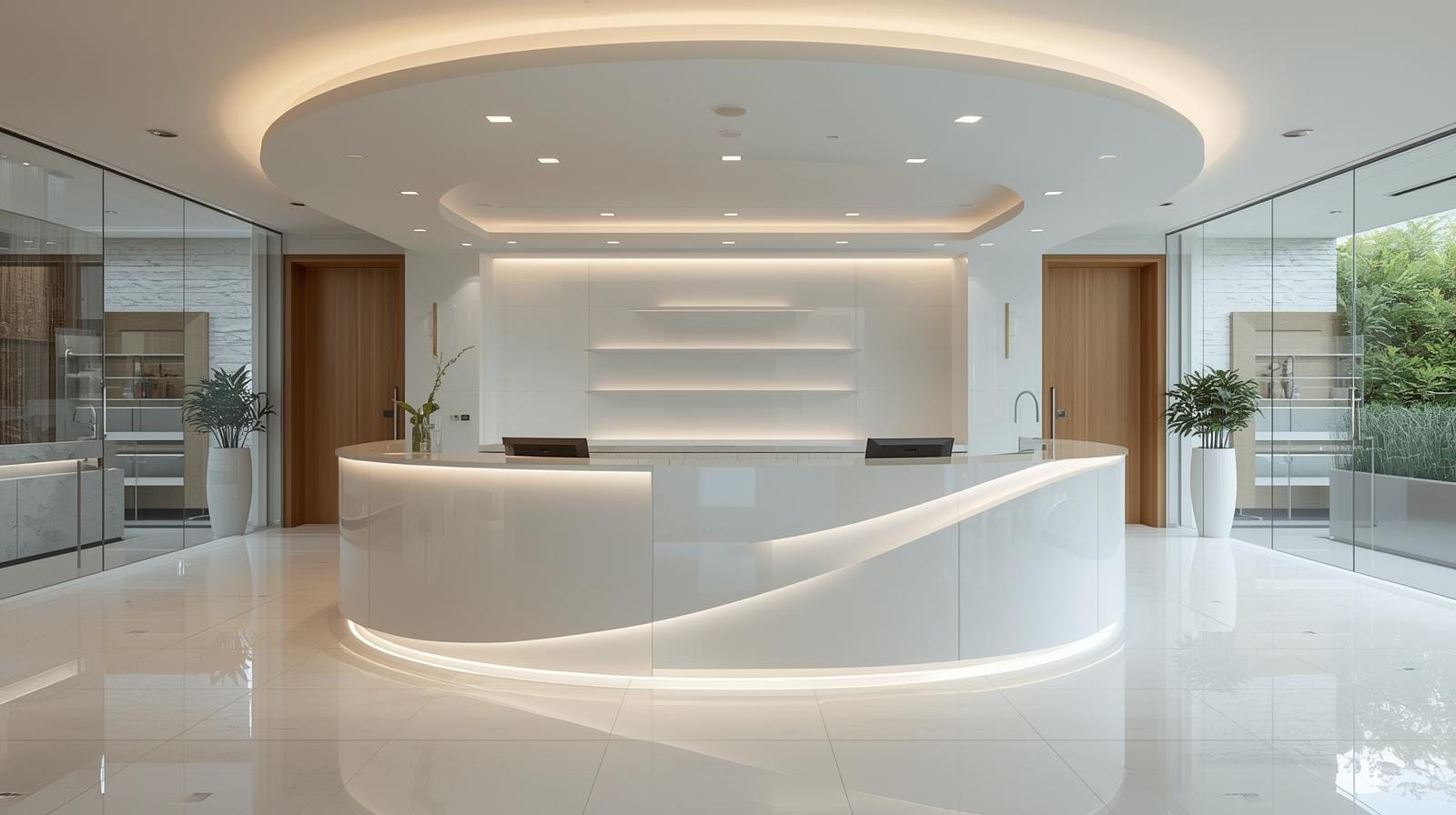 Quầy bo cong/oval: mang lại sự mềm mại, thu hút, hợp ngành spa, dịch vụ.