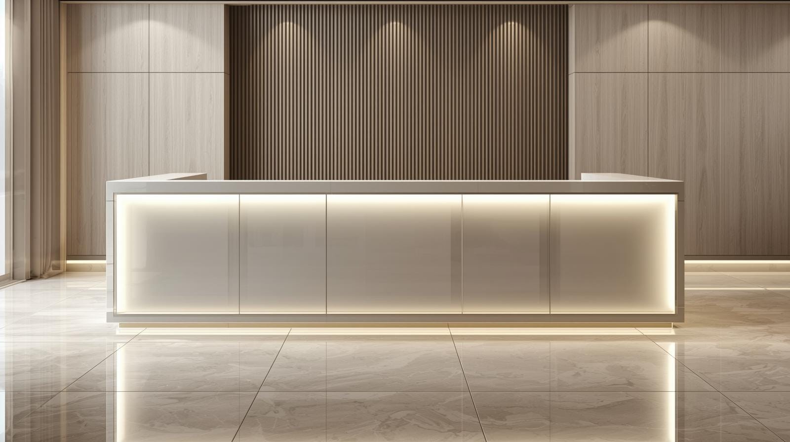 Quầy lễ tân chữ L.Trong bất kỳ doanh nghiệp, khách sạn, spa hay showroom nào, quầy lễ tân luôn là nơi đầu tiên khách hàng tiếp xúc. Chính vì vậy, việc lựa chọn kiểu dáng quầy lễ tân ảnh hưởng trực tiếp đến ấn tượng thương hiệu.