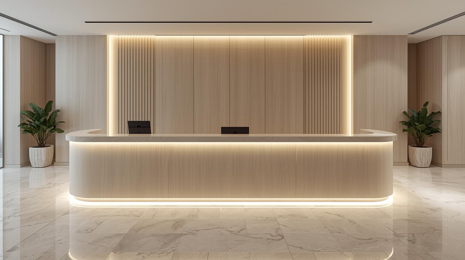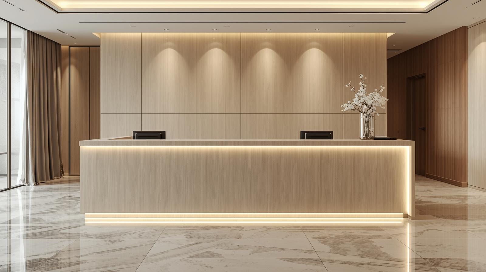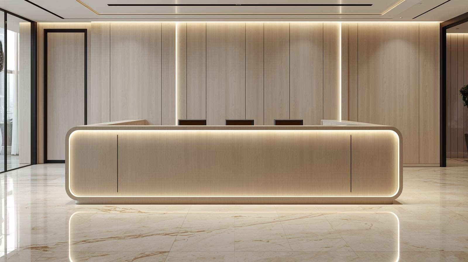 Khách sạn/Showroom ≥60 m²: chữ L cao cấp (2,4–3,0 m x 1,6–2,0 m); gỗ tự nhiên/MDF + veneer; mặt Marble/Granite; logo nổi, đèn điểm CRI ≥90.