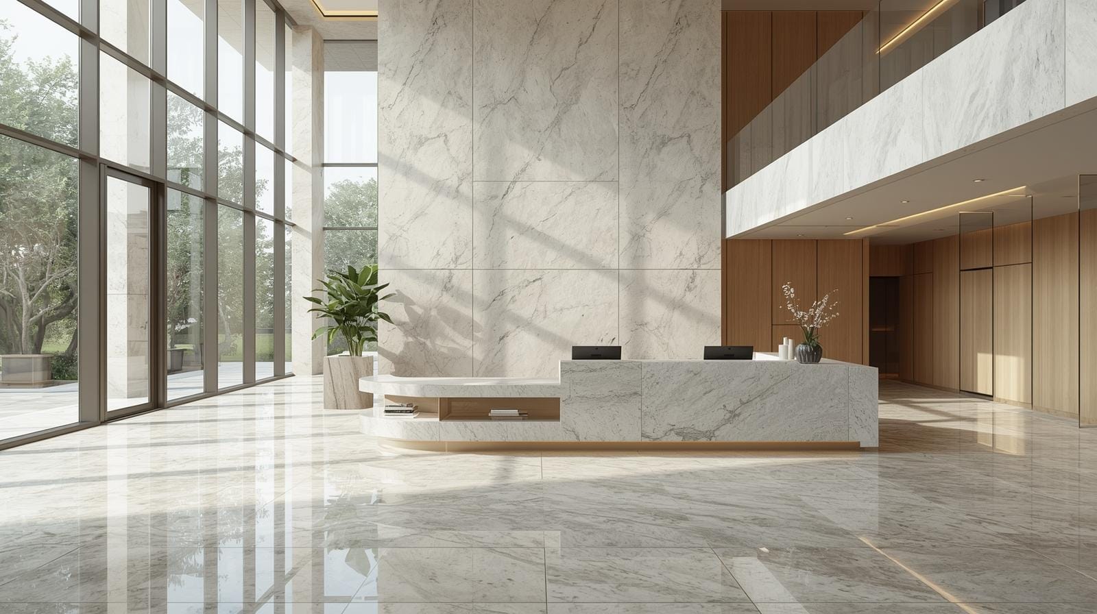 Thi công tinh xảo – bảo hành dài hạn: đảm bảo quầy lễ tân bền đẹp, đúng tiến độ.