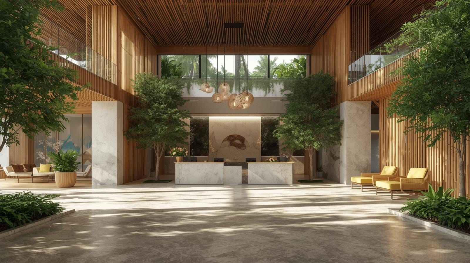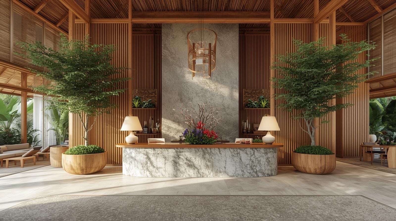 Nhiều resort cao cấp hướng tới phát triển bền vững bằng cách sử dụng vật liệu thân thiện: tre ép, gỗ tái chế, đá tự nhiên địa phương. Quầy lễ tân kết hợp thêm cây xanh, tiểu cảnh nước để mang đến cảm giác gần gũi và hài hòa với thiên nhiên.