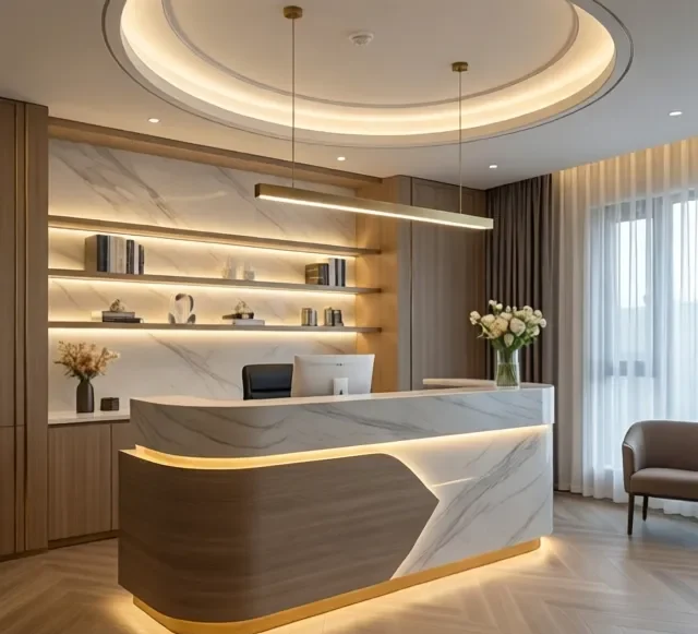 Ngoài ra, các mẫu quầy cong mềm mại đang rất được ưa chuộng vì tạo cảm giác sang trọng, uyển chuyển và phù hợp với phong cách spa cao cấp.
