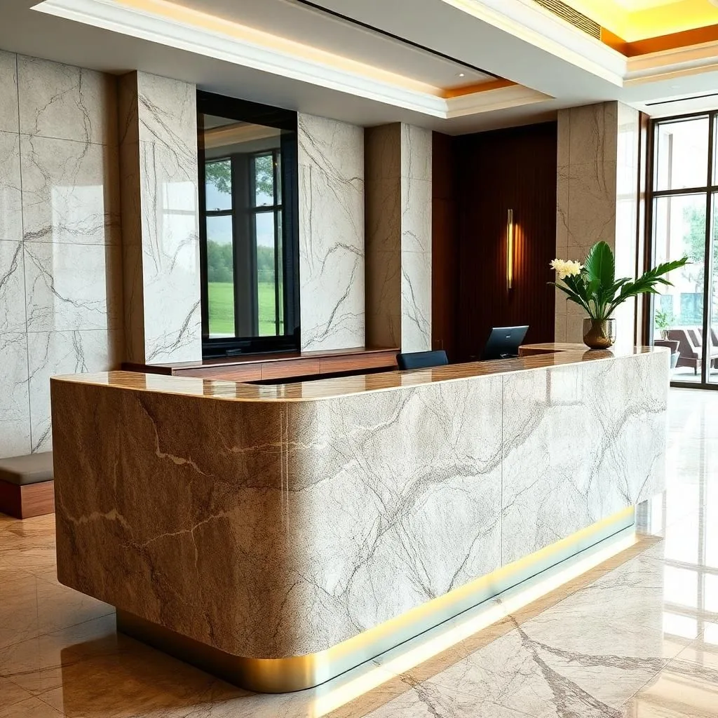 Các khách sạn, resort và trung tâm thương mại cao cấp thường chọn đá Marble, Onyx xuyên sáng hoặc Granite nhập khẩu. Thiết kế chữ U hoặc bo cong lớn, kết hợp đèn LED, logo inox mạ vàng và chi tiết trang trí cao cấp, mang đến sự uy nghi, đẳng cấp vượt trội.