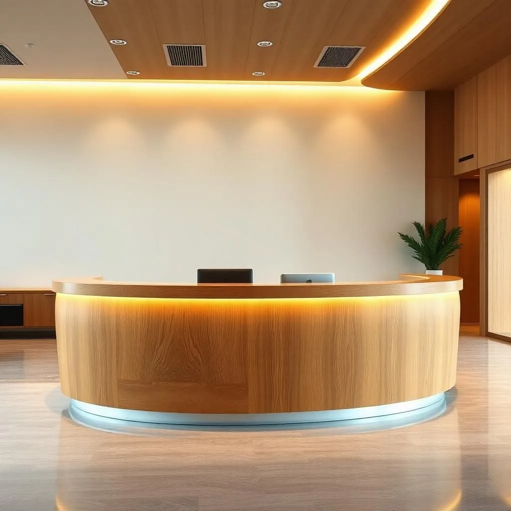 Nhiều quầy lễ tân gỗ tự nhiên hiện nay được tích hợp đèn LED âm trần hoặc logo phát sáng. Sự kết hợp này giúp làm nổi bật khu vực lễ tân, đồng thời tăng tính nhận diện thương hiệu.