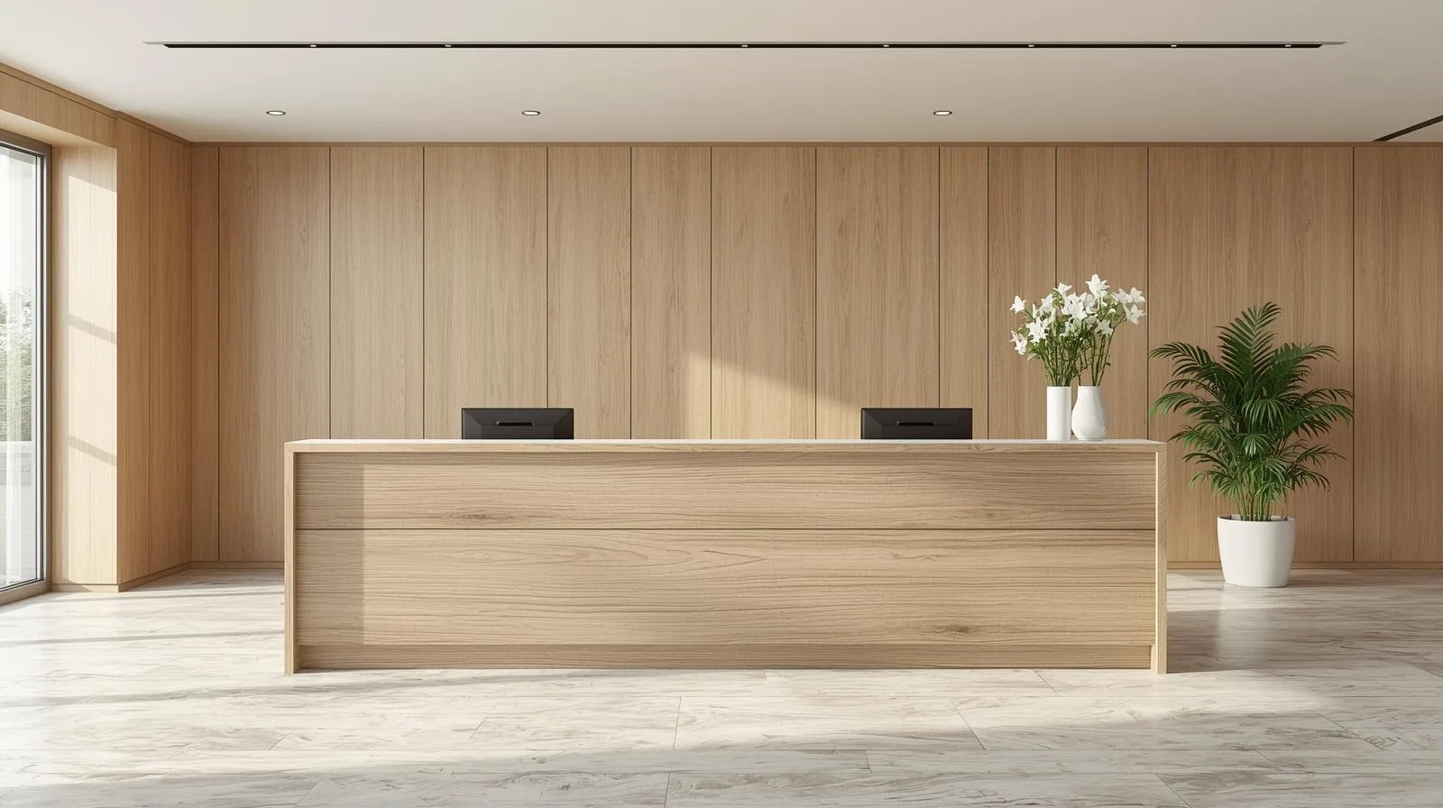 Laminate có khả năng chống trầy xước, chống va đập tốt, phù hợp với khu vực lễ tân – nơi thường xuyên tiếp xúc và có mật độ sử dụng cao.
