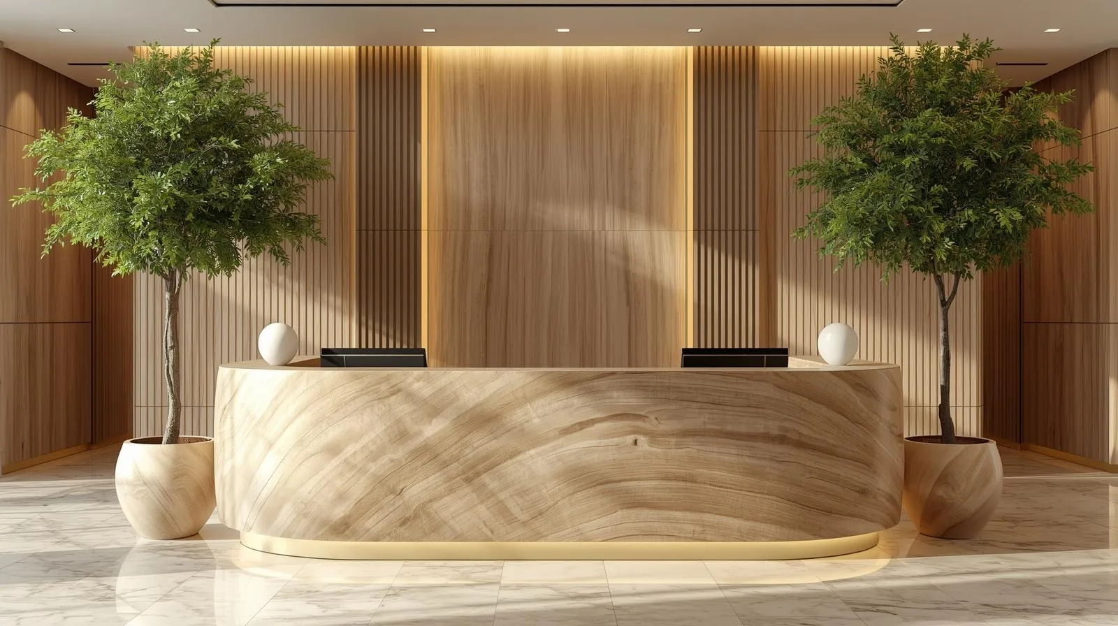 Laminate vân đá, vân gỗ óc chó hoặc ánh kim kết hợp với đèn LED logo, chi tiết inox mạ vàng tạo nên không gian uy nghi, đẳng cấp. Kiểu thiết kế này phù hợp với khách sạn, resort, trung tâm thương mại cao cấp.