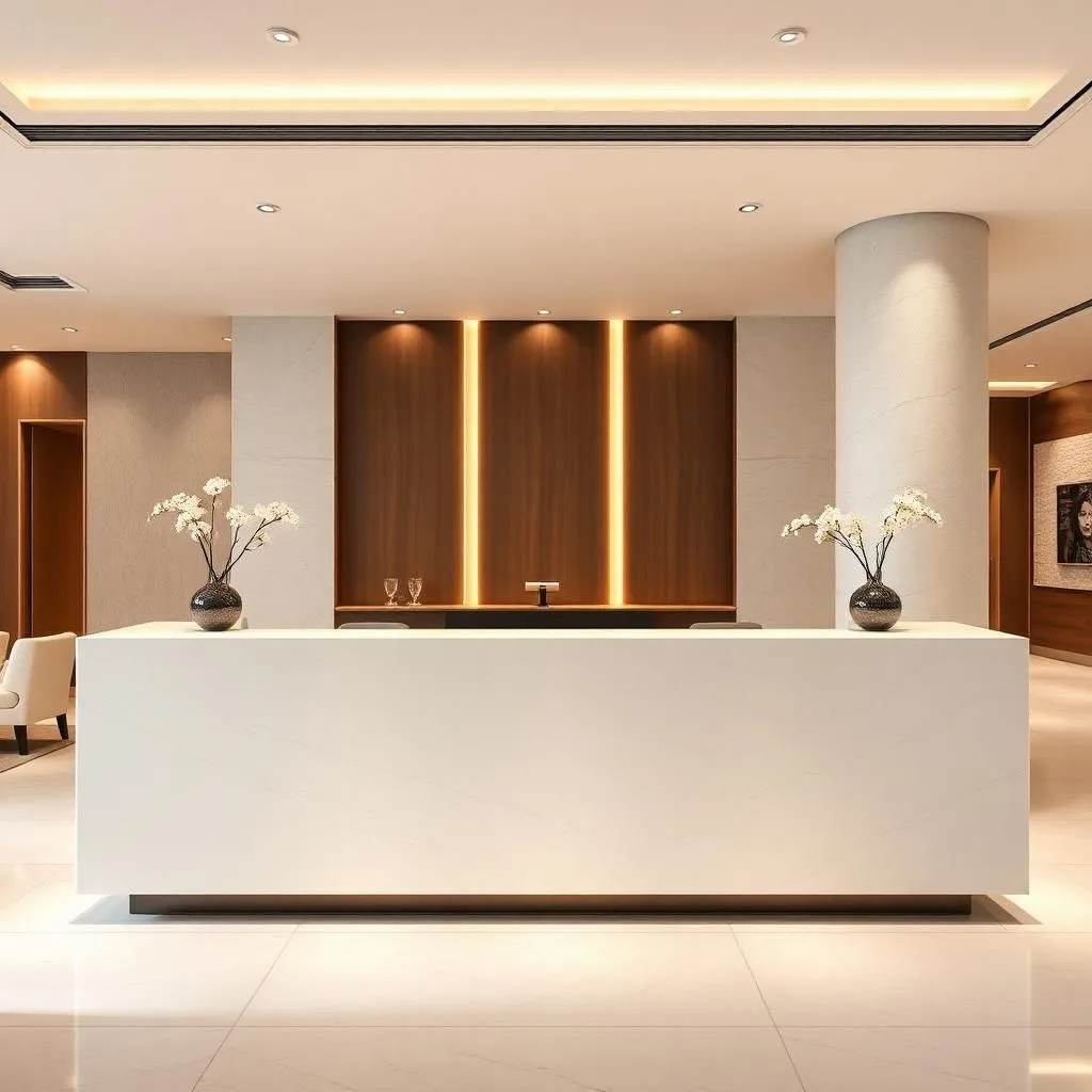 Các khách sạn, resort 4 – 5 sao thường ưu tiên quầy lễ tân Solid Surface vân đá tự nhiên, kết hợp ánh sáng LED và chi tiết inox mạ vàng. Thiết kế chữ U hoặc bo cong quy mô lớn giúp không gian thêm uy nghi, khẳng định đẳng cấp thương hiệu.