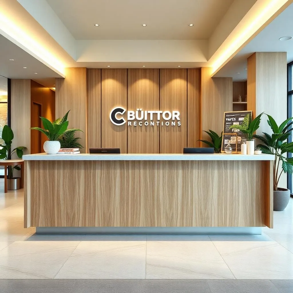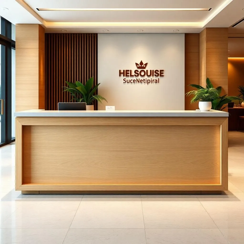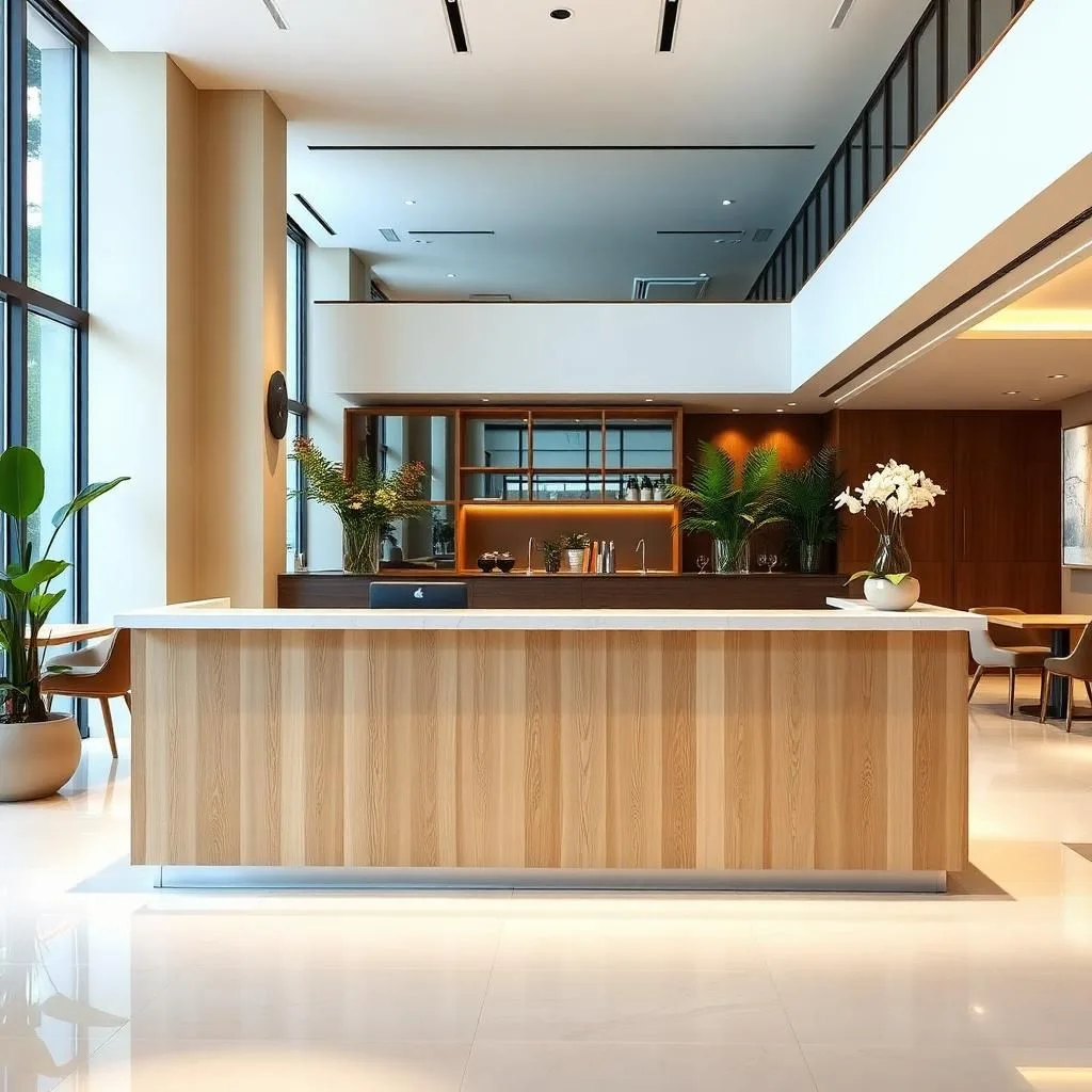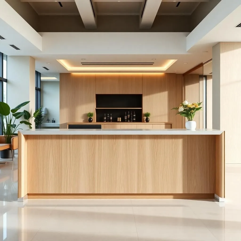 Các khách sạn, showroom xe, trung tâm thương mại cao cấp thường chọn quầy lễ tân 3m ốp đá marble, Solid Surface hoặc veneer gỗ óc chó. Kết hợp ánh sáng hắt và logo phát sáng, quầy lễ tân trở thành tâm điểm ấn tượng, thể hiện sự chuyên nghiệp và uy tín thương hiệu.