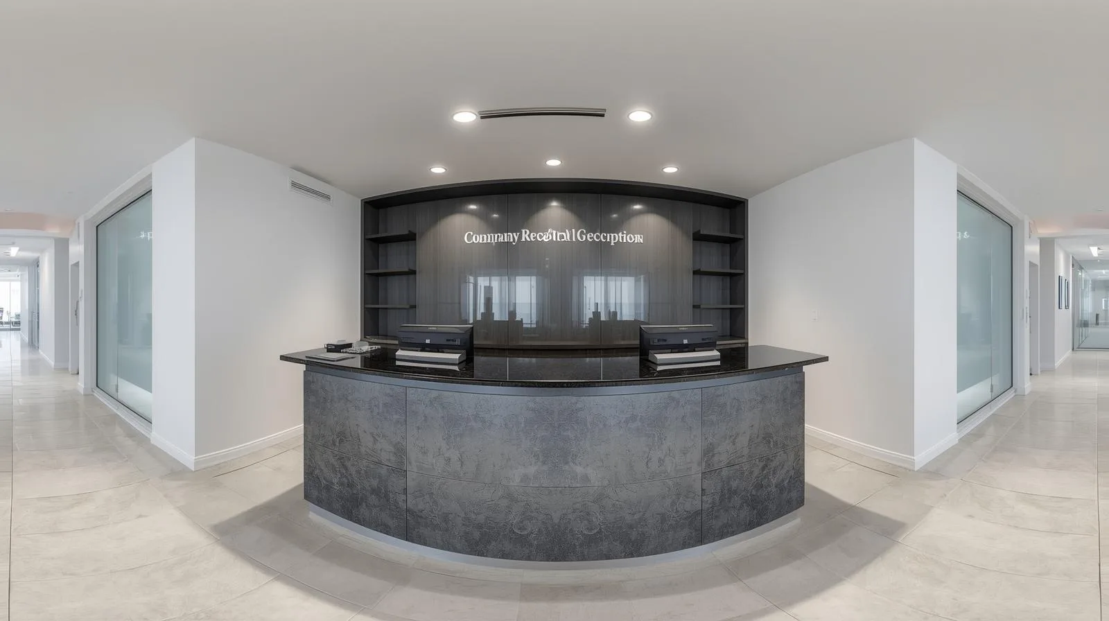 Showroom: Quầy bo cong hoặc chữ L, tích hợp logo và ánh sáng.