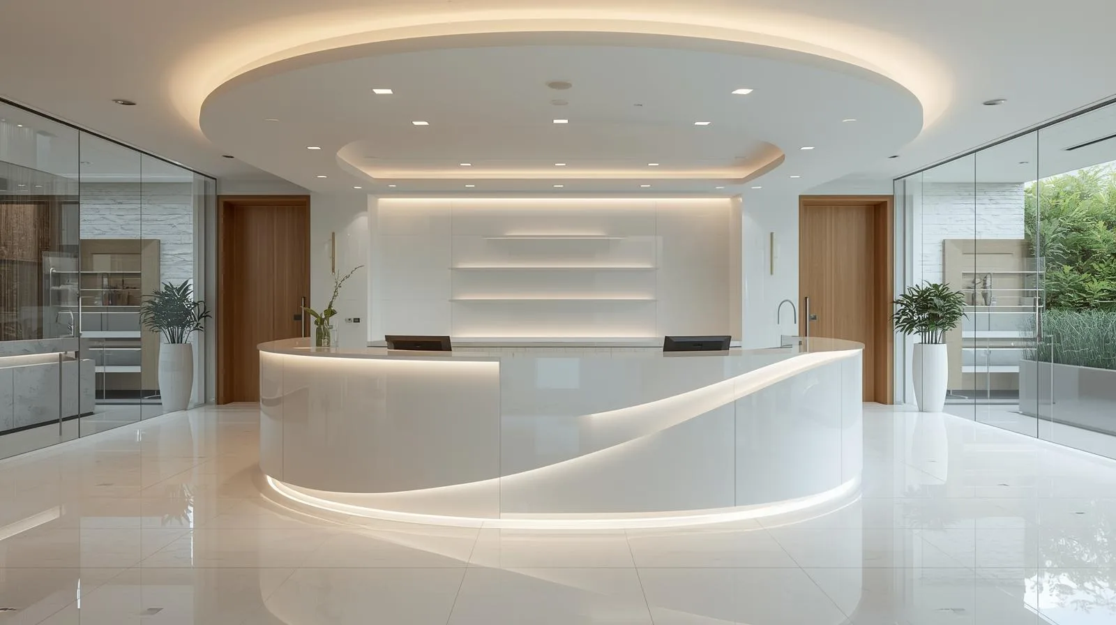 Spa – thẩm mỹ viện: Quầy bo cong, LED tạo cảm giác nhẹ nhàng.