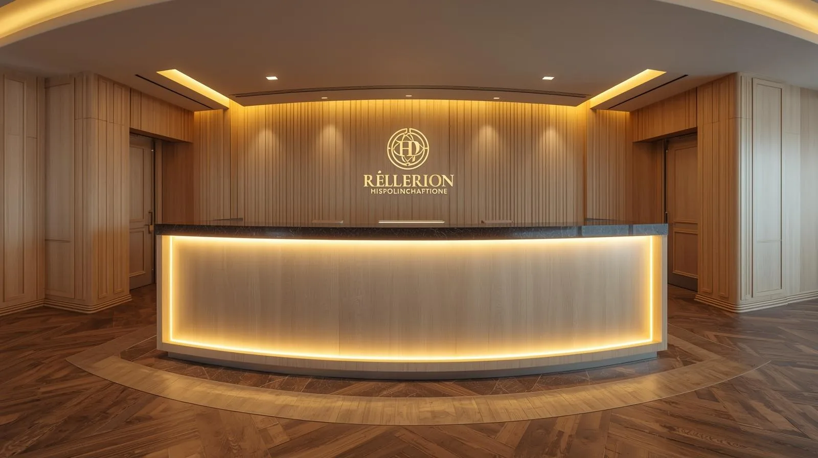 Quầy chữ U, oval hoặc bo cong: tạo sự sang trọng, thoáng đãng, đồng bộ với sảnh lớn.