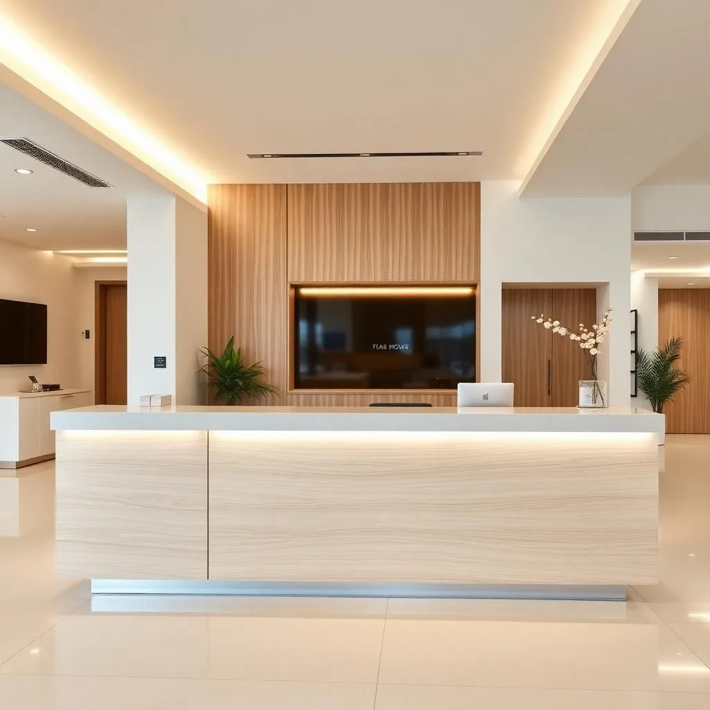 Nếu là khách sạn, showroom: cần quầy modular chữ U hoặc chữ L, kết hợp nhiều module để phục vụ nhiều khách cùng lúc.