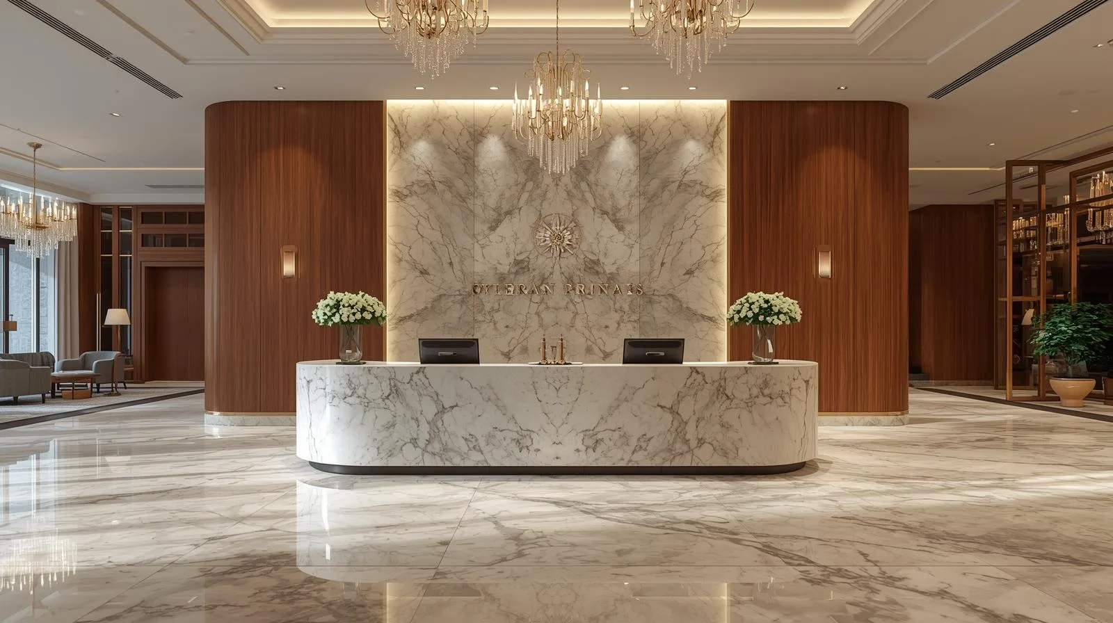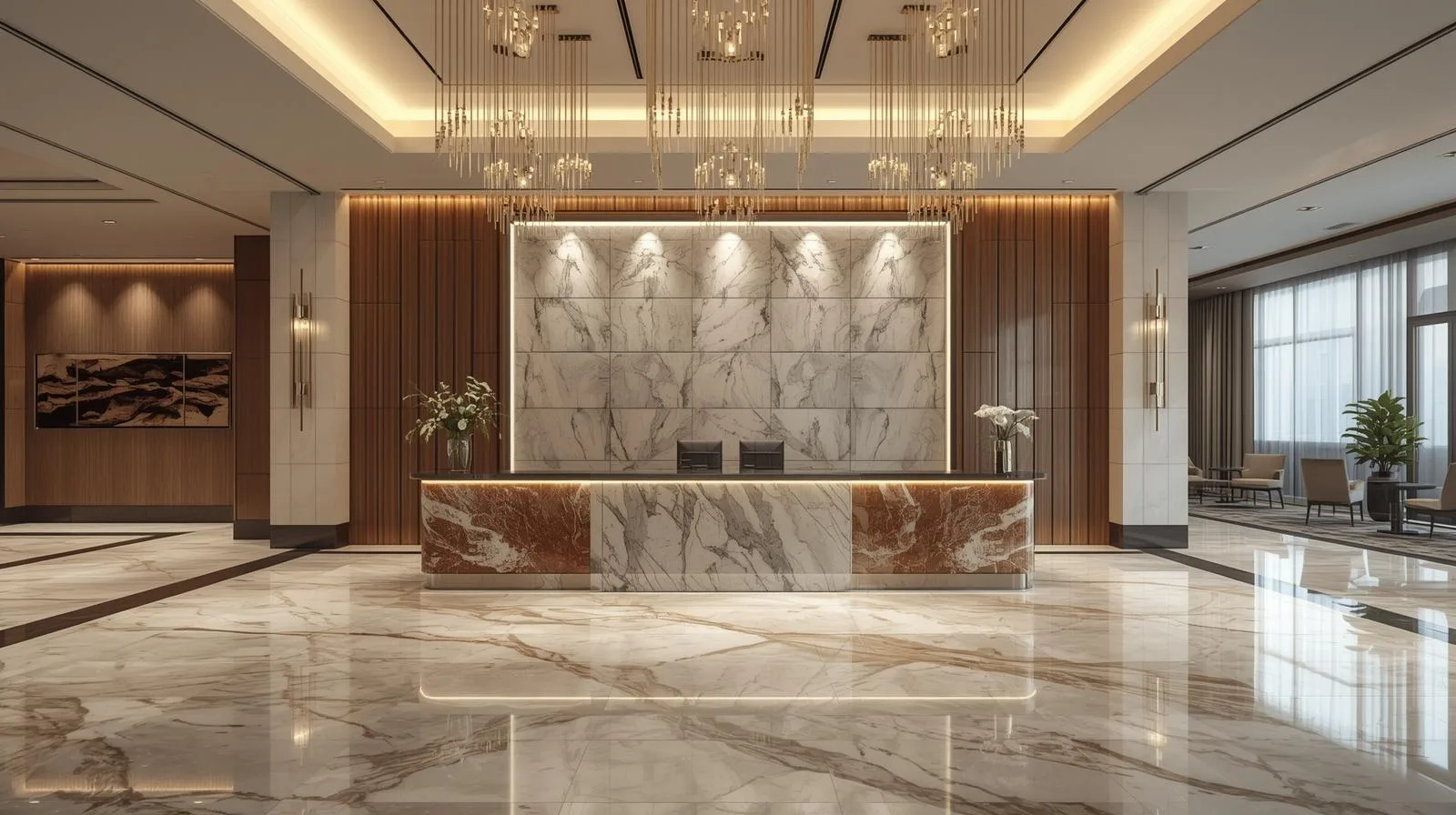 Ở phân khúc cao cấp, đá marble, onyx xuyên sáng, gỗ óc chó và inox mạ vàng được sử dụng phổ biến. Quầy lễ tân thường có thiết kế chữ U hoặc bo cong, kết hợp ánh sáng LED và logo phát sáng, tạo cảm giác uy nghi, đẳng cấp cho khách sạn 4 – 5 sao.