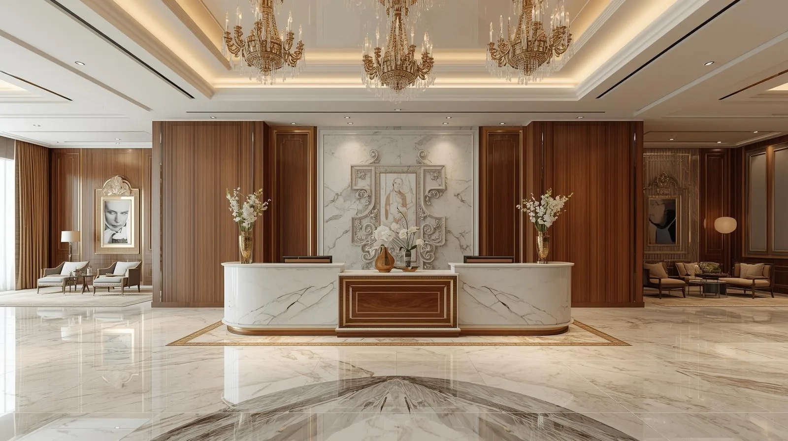 Một số khách sạn vẫn trung thành với thiết kế chạm khắc gỗ tự nhiên, gam màu nâu – vàng kết hợp đèn chùm pha lê. Quầy lễ tân phong cách này toát lên sự sang trọng cổ điển, phù hợp khách sạn lâu đời hoặc resort phong cách châu Âu.