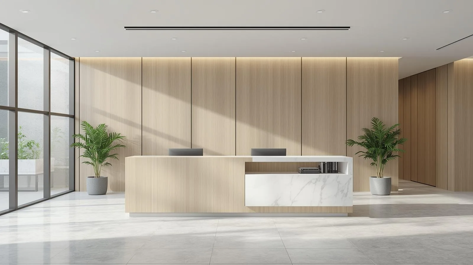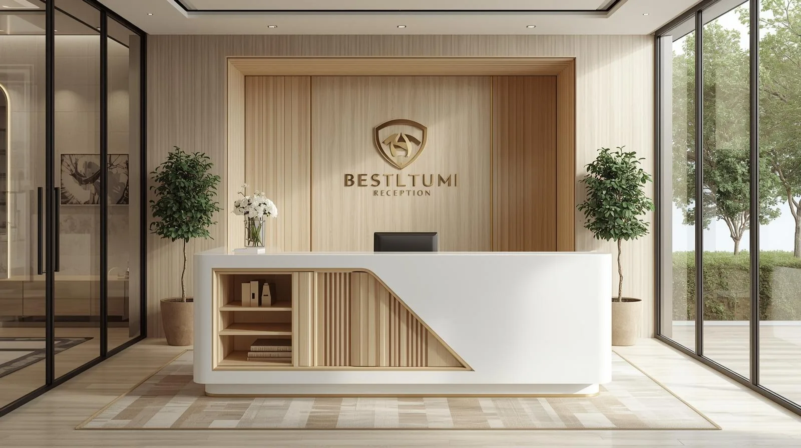 Nhiều doanh nghiệp hiện nay lựa chọn quầy lễ tân tối giản với thiết kế thẳng hoặc chữ L, gam màu trung tính như trắng, xám, be. Điểm nhấn nằm ở logo phát sáng hoặc một vài chi tiết trang trí nhẹ nhàng. Phong cách này phù hợp với startup, công ty công nghệ và những doanh nghiệp yêu thích sự hiện đại, gọn gàng.